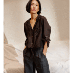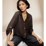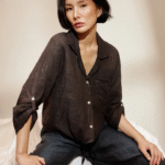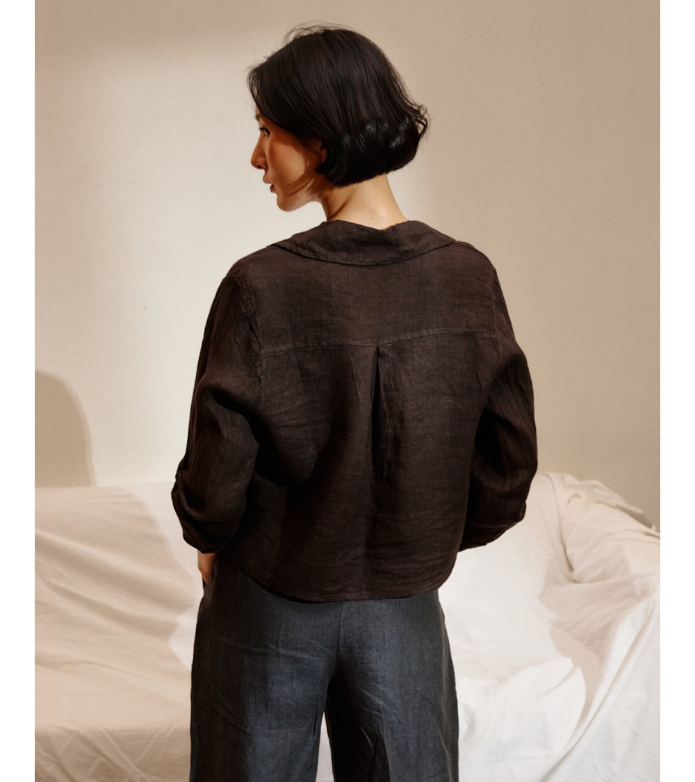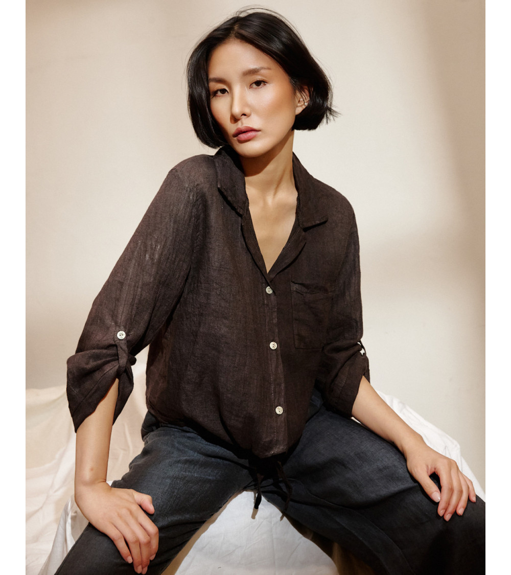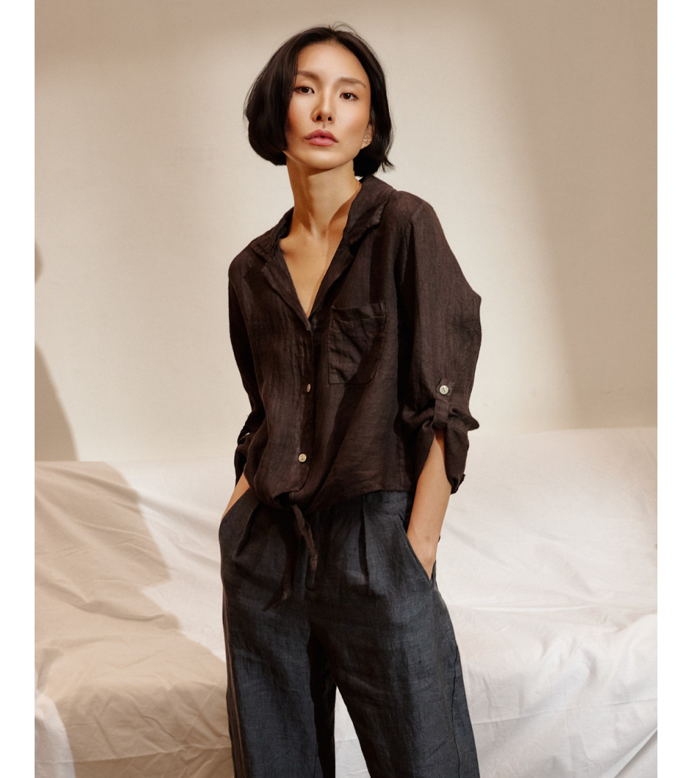 Camisa manga larga, lisa, con bolsillo y detalle de lazo en la cintura. Composición: 100% Lino.